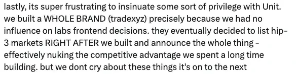 “We built the entire brand (tradexyz) from scratch precisely because we had no influence over Labs’ front-end decisions. They ultimately decided to launch HIP-3 on their official front-end immediately after we finished and announced the entire project—which effectively destroyed the competitive advantage we had spent a lot of time building. But we won’t complain about it; we will move on.”